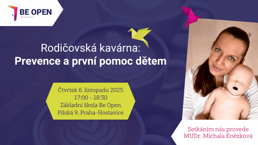 Rodičovská kavárna s tématem „Prevence a první pomoc dětem“ se koná ve čtvrtek 6. listopadu 2025 od 17 hodin v základní škole Be Open, Pilská 9, Praha-Hostavice.